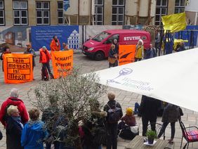 Zuerst spielt sie vor den Rathaustreppen, wobei am Ende auch der Oberbürgermeister Pit Clausen herauskam. Danach beweget sich der kleine "Demozug" in Richtung Alten Markt, wobei Herr Clausen leider nicht mitkommen wollte.Auch hier machte Brix von der Seebrücke Bielefeld auf die aktuelle Situation der Seenotrettung im Mittelmeer Aufmerksam, welche im Prinzip nicht mehr vorhanden ist. Da die offizielle Seenotrettung der EU eingestellt wurde und diese der korrupten lybischen Küstenwache überlassen wurde. Und den ehrenamtlichen Seenotretter, wie z.B. die Iuventa oder die Seawatch werden strafrechtliche Steine in den Weg gelegt.